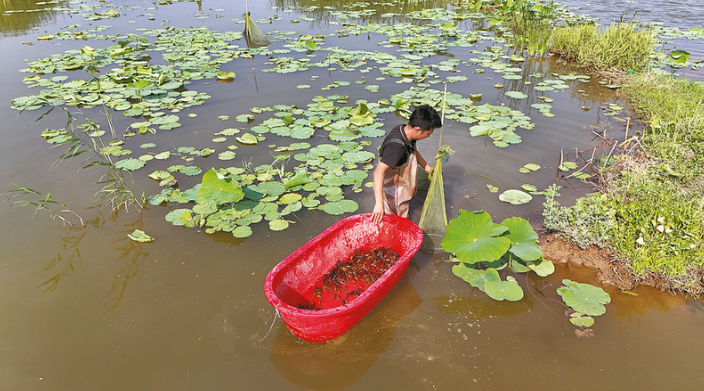 5月26日,在合陽縣魚蝦蓮混養基地內,養殖戶正在收網,檢查小龍蝦的生長情況。