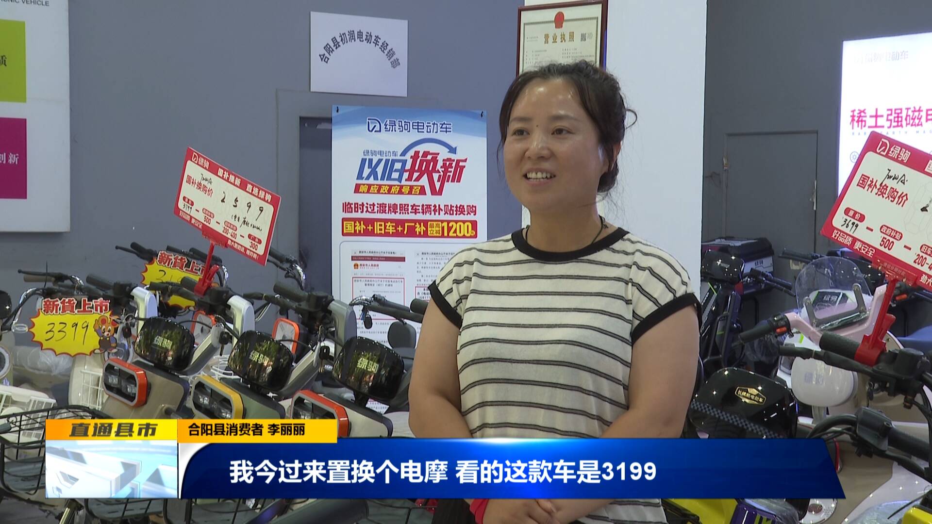 在合陽(yáng)縣綠駒電動(dòng)車(chē)專(zhuān)賣(mài)店內(nèi),顧客李麗麗正在選購(gòu)電動(dòng)車(chē),當(dāng)聽(tīng)到原價(jià)3199的電動(dòng)車(chē),享受以舊折新的活動(dòng)后,能享受到500元的政策補(bǔ)貼。