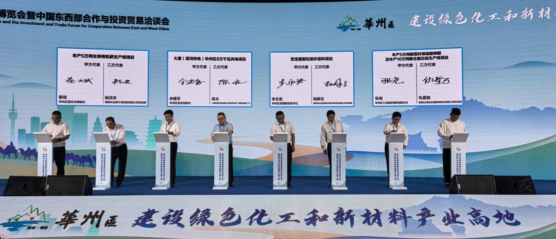 華州區本屆絲博會簽約的9個項目為:總投資6.24億元的鉬金屬生產線建設項目;總投資4.18億元的鉬基材料鍛造生產線建設項目;總投資13.49億元的鉬化工生產線建設項目;總投資1.79億元的825噸貴金屬前驅體新材料項目;總投資0.24億元的年產5萬噸生物有機肥生產線項目;總投資4億元的大唐(渭河熱電)華州區8萬千瓦風電項目;總投資1.1億元的變寶餐廚垃圾環保科技項目;總投資0.75億元的年產5萬噸新型環保硫酸鉀肥及年產10萬噸聚合氯化鋁生產線項目;將于21日簽約的總投資5.46億元的大唐(富平熱電)華州區 10萬千瓦風電項目。