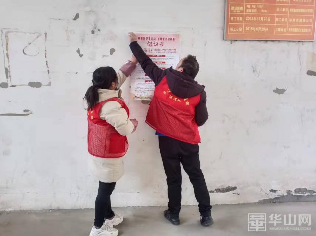 華山鎮(zhèn)西站社區(qū)工作人員在各小區(qū)醒目位置張貼《愛國衛(wèi)生倡議書》,同時向居民發(fā)放《愛國衛(wèi)生倡議書》宣傳彩頁,講解日常生活小妙招、號召居民“勤洗手、留距離、戴口罩、少聚集”。