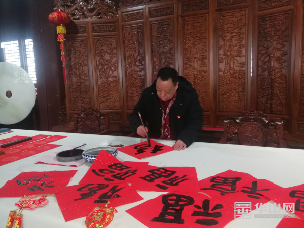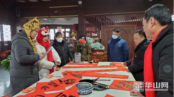 此次活動首先帶領大家直播參觀西岳廟的美麗風景,通過主播與講解員的交流、與線上觀眾的現場互動,了解了西岳廟的歷史變遷和故事傳說。在直播最后,西岳廟文物管理處總工程師、中書協會員張躍峰同志帶領華陰書協老師們在西岳廟萬壽閣現場書寫、贈送春聯和“?!弊?,在歡樂祥和的節日氛圍中,傳承節日文化。紅紅春聯送祝福,濃濃墨香暖人心,一幅幅春聯剛勁有力、磅礴大氣,既有充滿辭舊迎新的美好愿景,也有平安吉祥、和諧發展的勵志高歌,表達了華山人為全國人民送上美好的祝福。