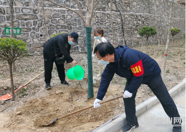 植樹現場,紅旗飄揚,氣氛熱烈。大家干勁十足,在景區綠化工作人員指導下,分工協作,配合默契,培土圍堰、提水澆灌。經過近兩個小時的緊張勞動,共栽植白皮松、玉蘭等各類樹木60余棵。