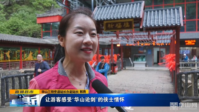 華山三特索道站長辦副站長 郭燕:“讓游客感受‘華山論劍’的俠士情懷,為了滿足游客這一需求,之后我們會在此基礎(chǔ)上放大完善文化線路,以金庸‘華山論劍’俠文化為主體,全力打造沉浸式游玩環(huán)境。”