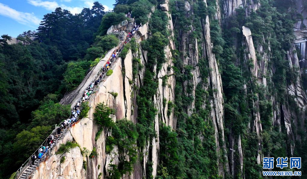 游客在華山北峰蒼龍嶺攀登游覽(8月10日攝,無人機照片)。