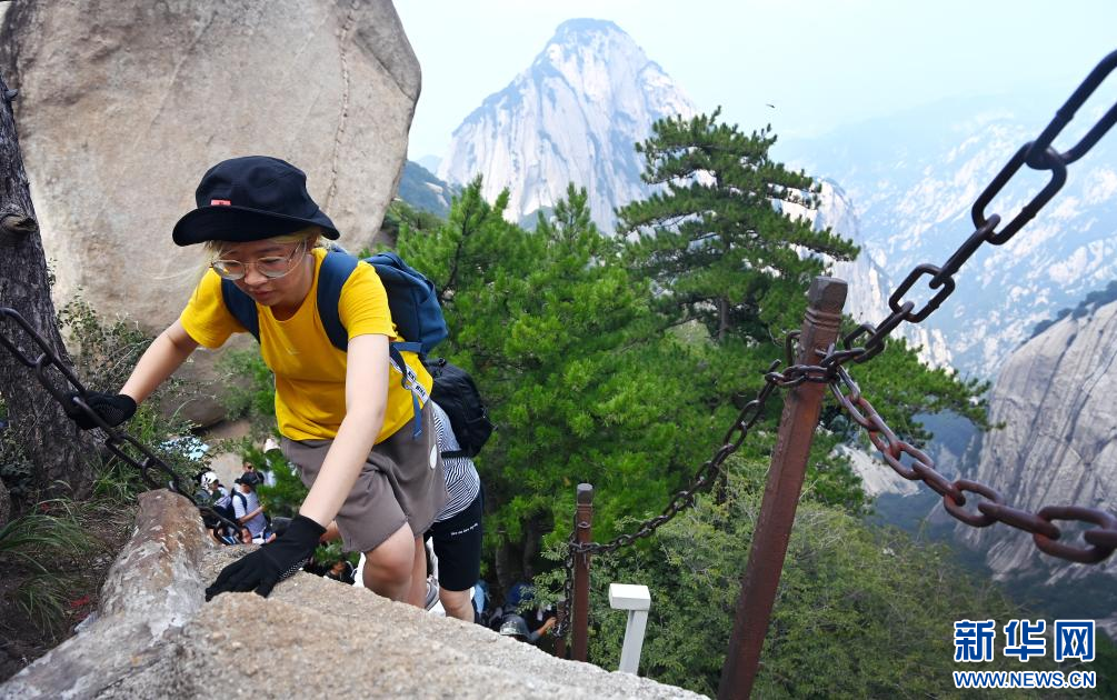 游客在華山北峰攀爬游覽(8月10日攝)。