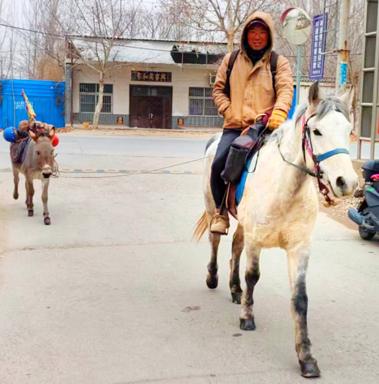 記者在華陰市羅敷鎮一縣鄉路段看到一名騎馬男子由西向東行進,馬的后面還緊跟著一頭驢。