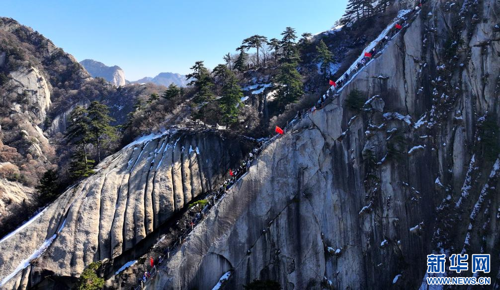 游客在攀登華山蒼龍嶺(2月12日攝,無人機照片)。