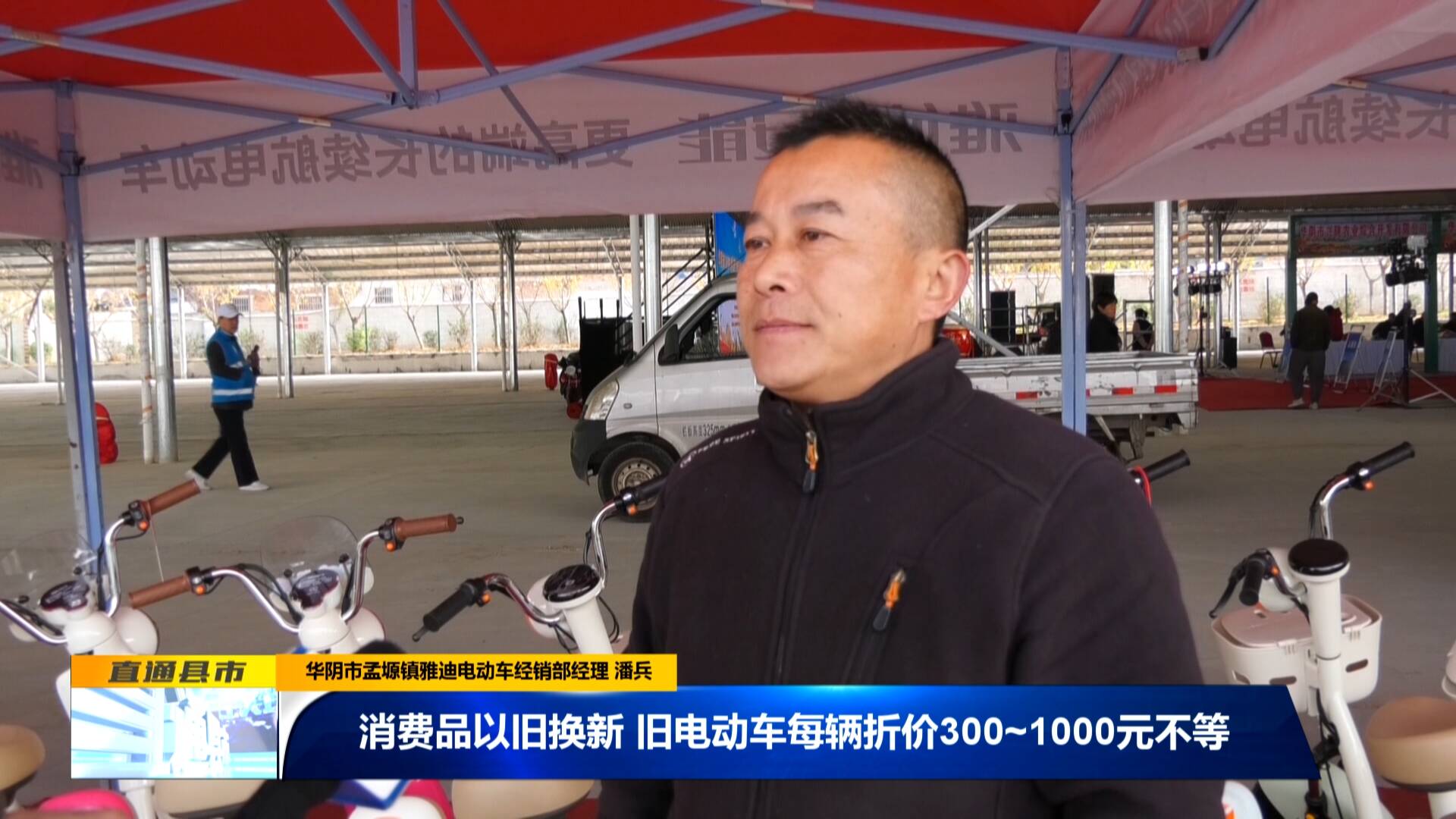 華陰市孟塬鎮雅迪電動車經銷部經理 潘兵:“消費品以舊換新,舊電動車每輛折價300~1000元不等。像這臺電動車價值2000元,最高折舊1000元,消費者1000元可以帶走。”
