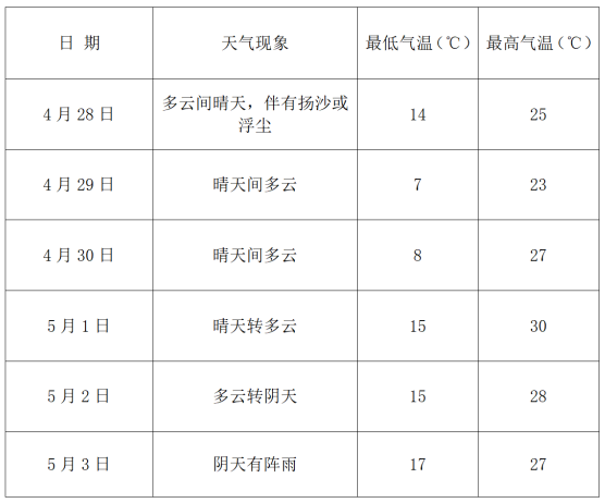 根據最新氣象資料分析,預計28日白天至夜間,我區有4~5級偏北風,陣風可達6級以上,并伴有揚沙或浮塵,空氣質量較差,29日白天浮塵減弱,空氣質量好轉。“五一”節假日期間,天氣以晴為主,3日有弱降水。具體預報如下: