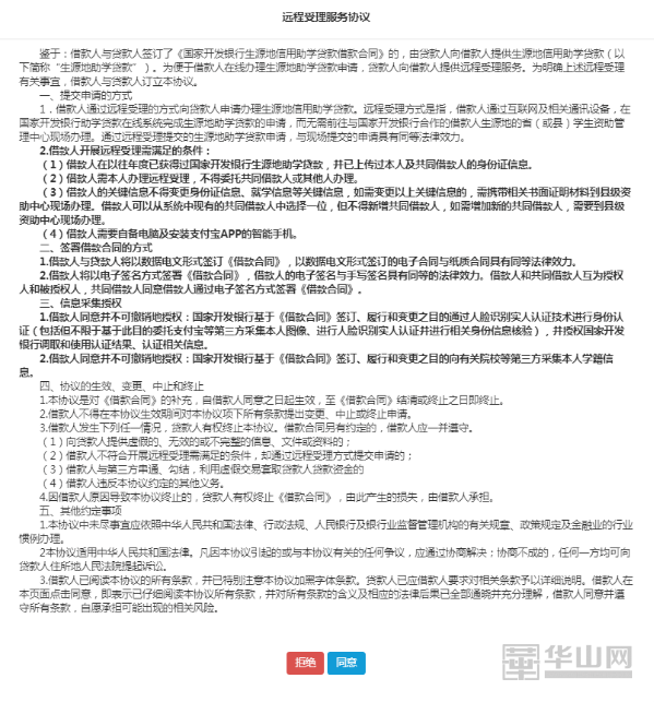 提交申請信息后,系統將提示學生選擇”網上簽訂合同“或”資助中心現場簽訂合同“,需要同意《國家開發銀行生源地助學貸款續貸遠程受理協議書》,同意通過電子簽名方式簽訂助學貸款合同,并明確雙方法律責任。