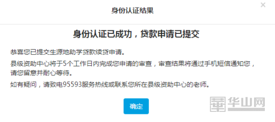 完成在線申請辦理后,系統將會提示在線申請辦理完成,并將相關信息提交至資助中心。