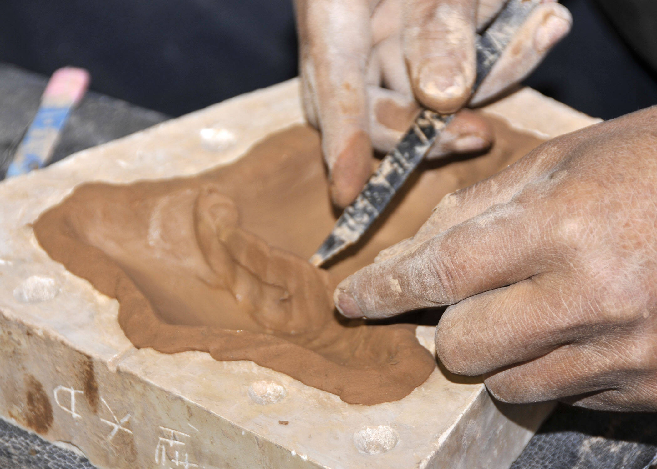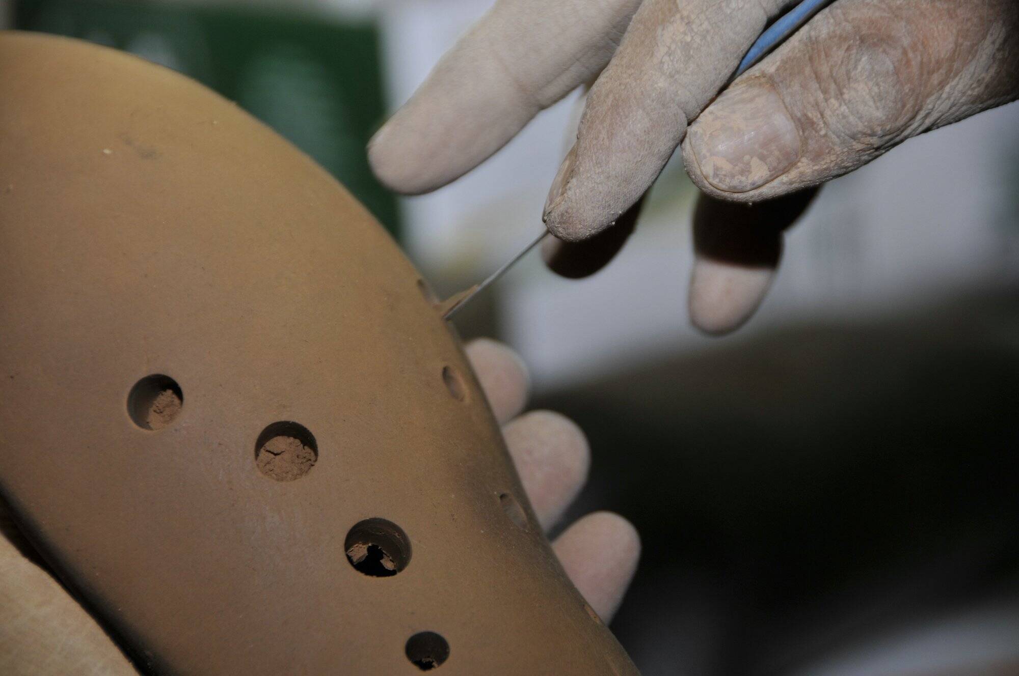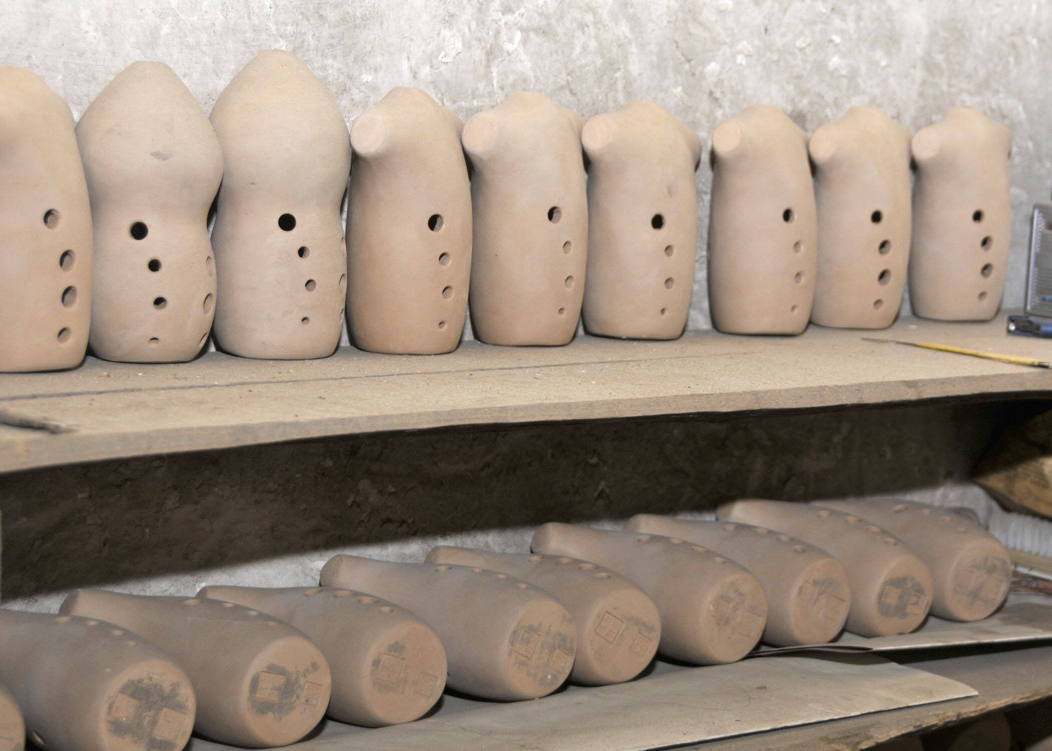 制作過程包括選土、洗泥、練泥、醒泥、設計制作模具、制坯、開孔、外表裝飾、試吹、拋光、調音、燒窯等十幾道工序。蒲城秦塤制作在發掘與繼承傳統技藝的基礎上創造性地在腔體內安裝了調音板和消除雜音的蜂窩裝置。