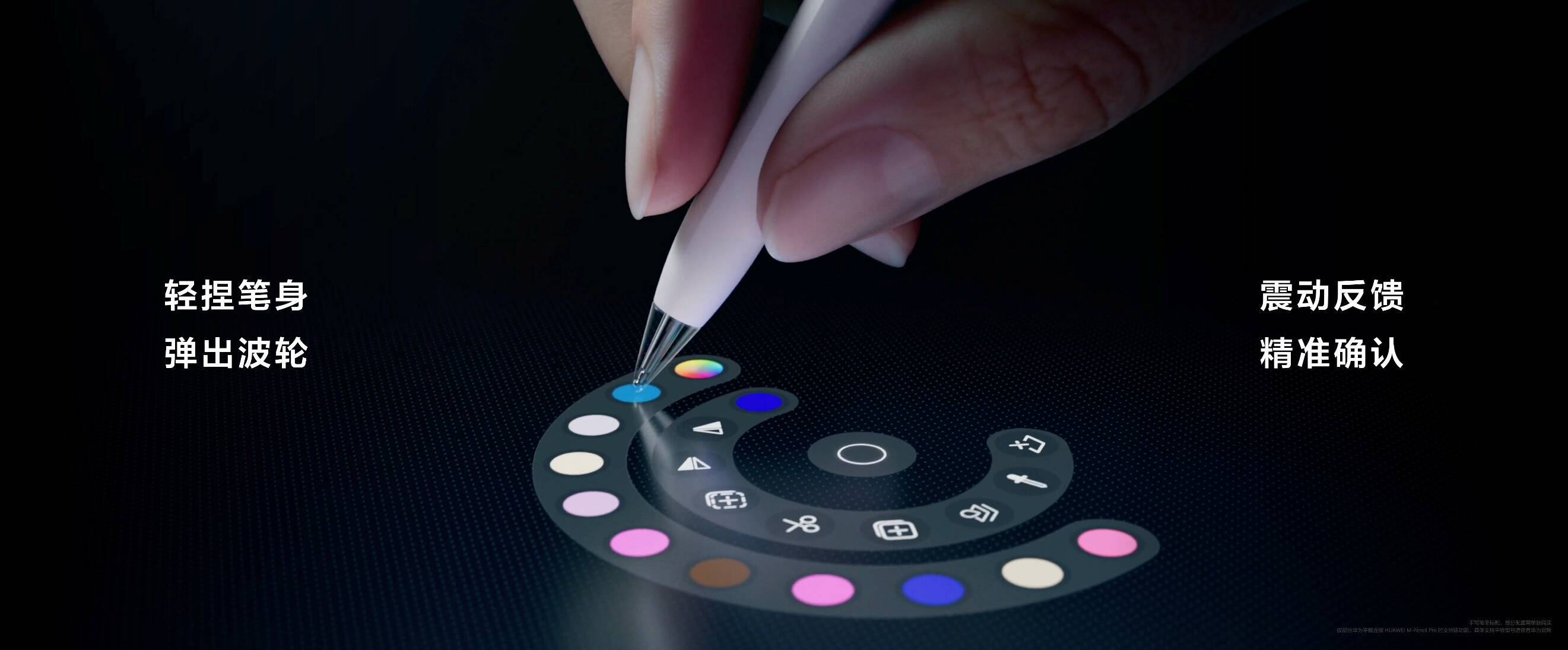 新款手寫筆打造了場景化的交互方式。在天生會畫App及華為筆記中,輕捏筆身快速切換筆形、色板、菜單,雙擊筆身,還可以在筆和橡皮擦之間切換,助力高效創作。在其他界面,輕捏彈出全局波輪,直達速記、一鍵摘錄、全局批注、小藝圈選等功能,讓各類操作一步直達。配合筆身內置微型馬達帶來的振動反饋,無論是輕捏、重捏,還是雙擊筆身,均能提供清晰的觸覺提示,讓交互體驗更加自然生動。